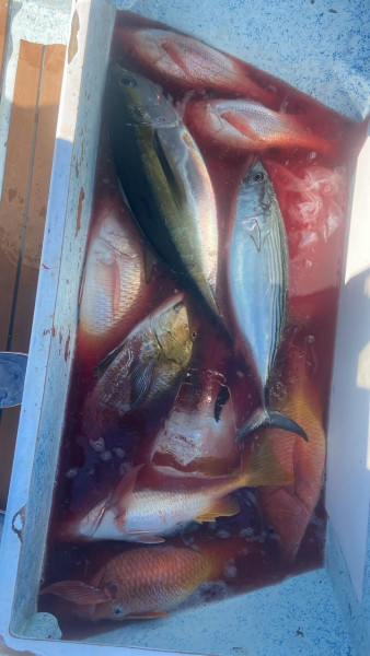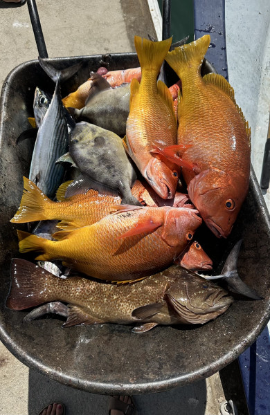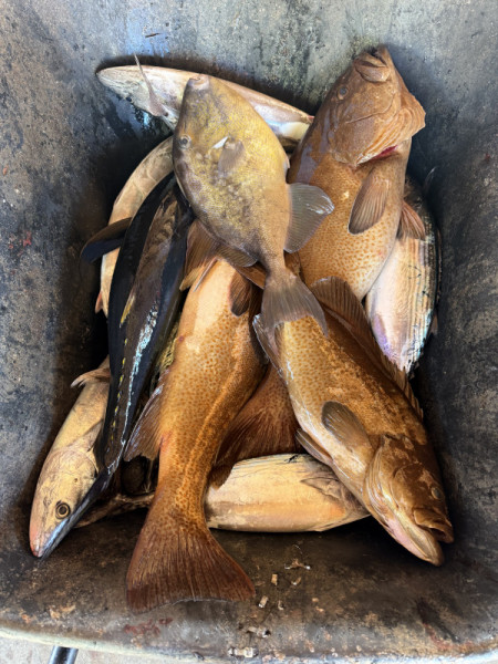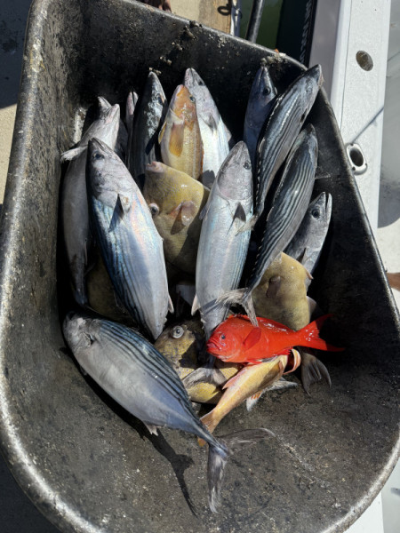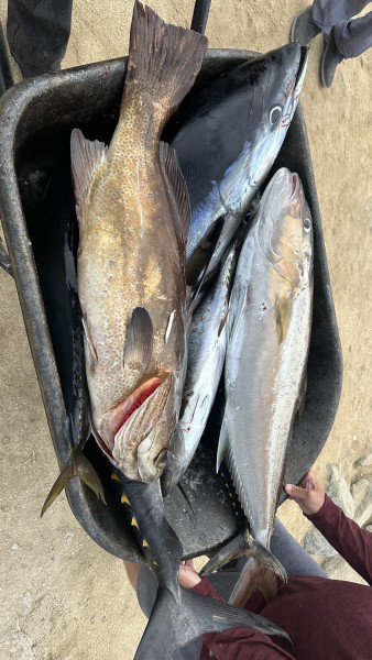 Later in the week, boats from Cabo got word of this bite and it made Iman crowded. On Friday, there were close to 50 boats in the small area of Iman. This did not help much as the bite slowed down significantly throughout the weekend. Many boats were forced to head closer to shore to look for bottom fish, sierra, and roosterfish. Close to shore, throughout different rock structures of La Fortuna and Cardon, we were able to catch good numbers and variety of bottom fish. We had grouper, snapper, pompano, triggerfish, amberjack, sierra, and a few yellowtail. Most of this mix was caught drifting dead sardines. A few bigger sierra were caught casting jigs on the surface.