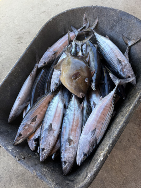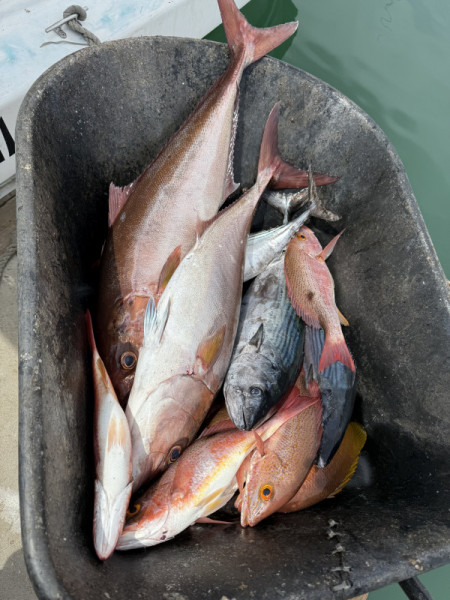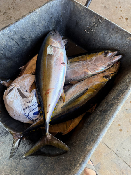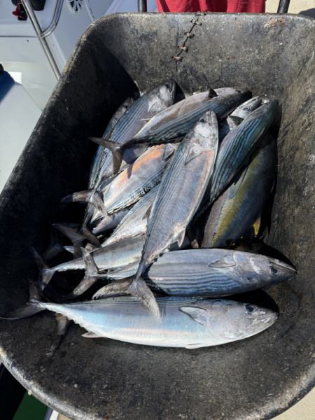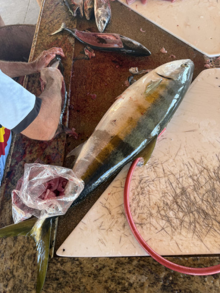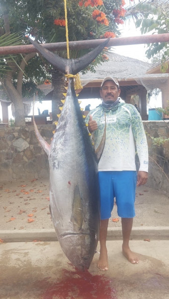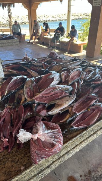 We had a good tuna bite at Iman throughout the week. Most of these tuna continue to be on the smaller side, averaging 6-10 pounds. However, there is a great chance of hooking into a 100 lb. + fish in the same area. For that reason, we try to go no lighter than 40# test. Most boats are catching at least a couple of these small tunas every day. Some boats were been able to catch their tuna limits as well. We continue to catch white bonita limits on the jigs and sardines almost every day. A few bait guys were able to come up with live sardines this week, however it was not enough to supply all boats; only a handful of boats got their hands on the live dines. We did have plenty of dead sardines. The bait guys are having to net sardines towards the east cape in the afternoons. The bigger tuna this week were caught on live and dead sardines (mostly dead), strips of squid, and strips of skipjack. The best day this week was Thursday as we had 5 big tuna at our fillet table. The biggest tuna came in at 187 pounds, the rest were in the range of 95 to 125 pounds. A couple more big tuna were lost that day after long hour battles.