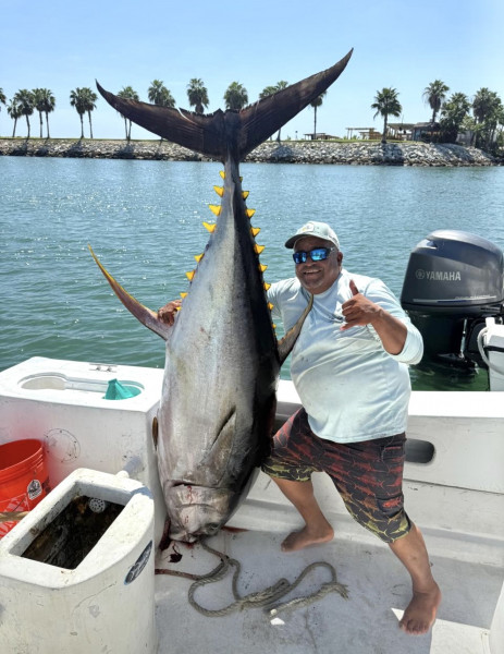 On Saturday, Captain Chame landed a massive 308 pound yellowfin tuna. This fish was hooked on the outer Gordo on a live skipjack. This same day, they also landed a 180-200 pound blue marlin.