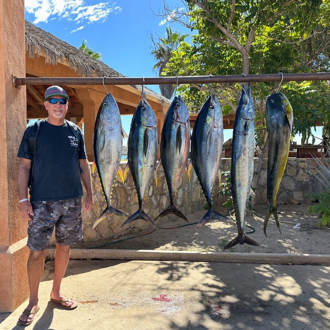 Live bait continues to be a challenge, though we did see a better supply this week. The bait guys were able to net live sardines throughout the shorelines of Palmilla Point and in front of the lighthouse next to the marina. These sardines have been on the small side, so most boats are using them to chum while they try to hook the bigger tuna on the dead sardines (bigger size). These dead sardines continue to come from the East Cape. We have also seen small caballito schooling binside the marina. This time of year, we recommend a good variety of baits (dead/live sardines, caballito, ballyhoo, squid) as we focus on tuna, wahoo, and dorado.