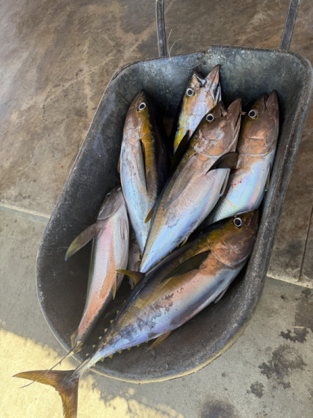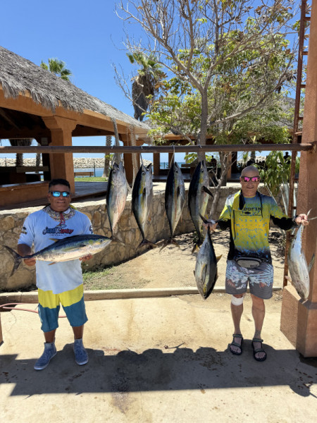Surprisingly, the bite was consistent throughout most of the week. It was a bit slower this weekend, though we were still able to bring these tuna up to the surface. On most days, our pangas were able to catch their limit within the first hours of the morning. These tuna are averaging 15-20 pounds, with a handful of 30-40 pounders in the mix. On Wednesday, one of the cruisers landed a 110-pound tuna on a dead sardine. This fight took almost 2 hours on 40#test/#40fluoro. We have also seen some small dorado schools (5-12 pounds) and sailfish chase the sardines along with the tuna and skipjack. We are using live sardines that the bait guys are netting along the jetty structures of our marina. Bait guys reported a lower sardine supply this weekend. We will see how this affects the tuna bite in the upcoming days.