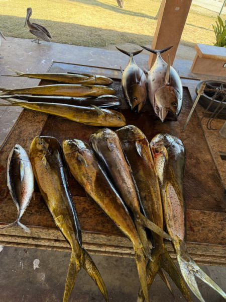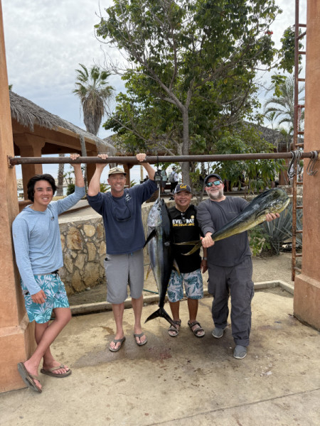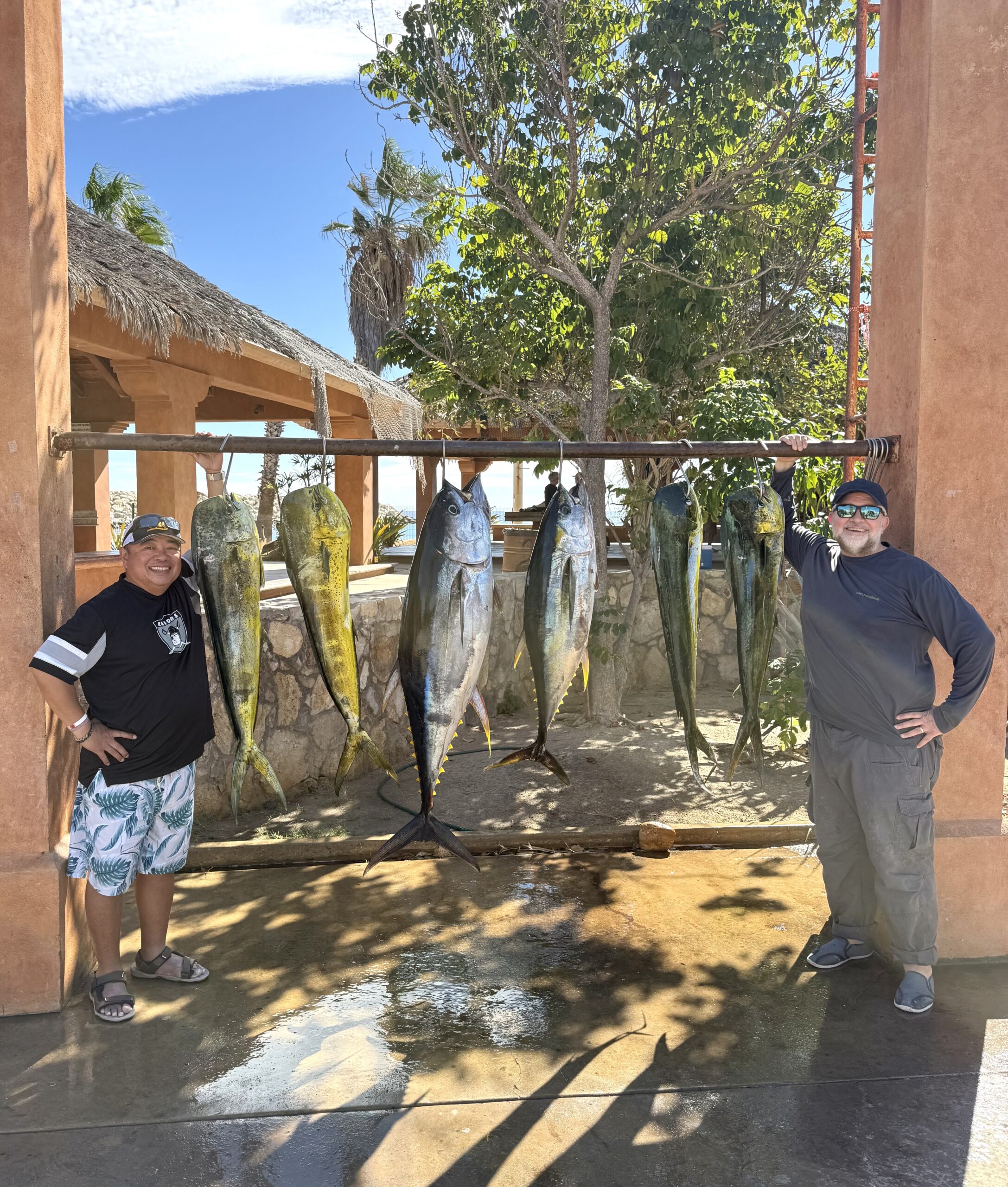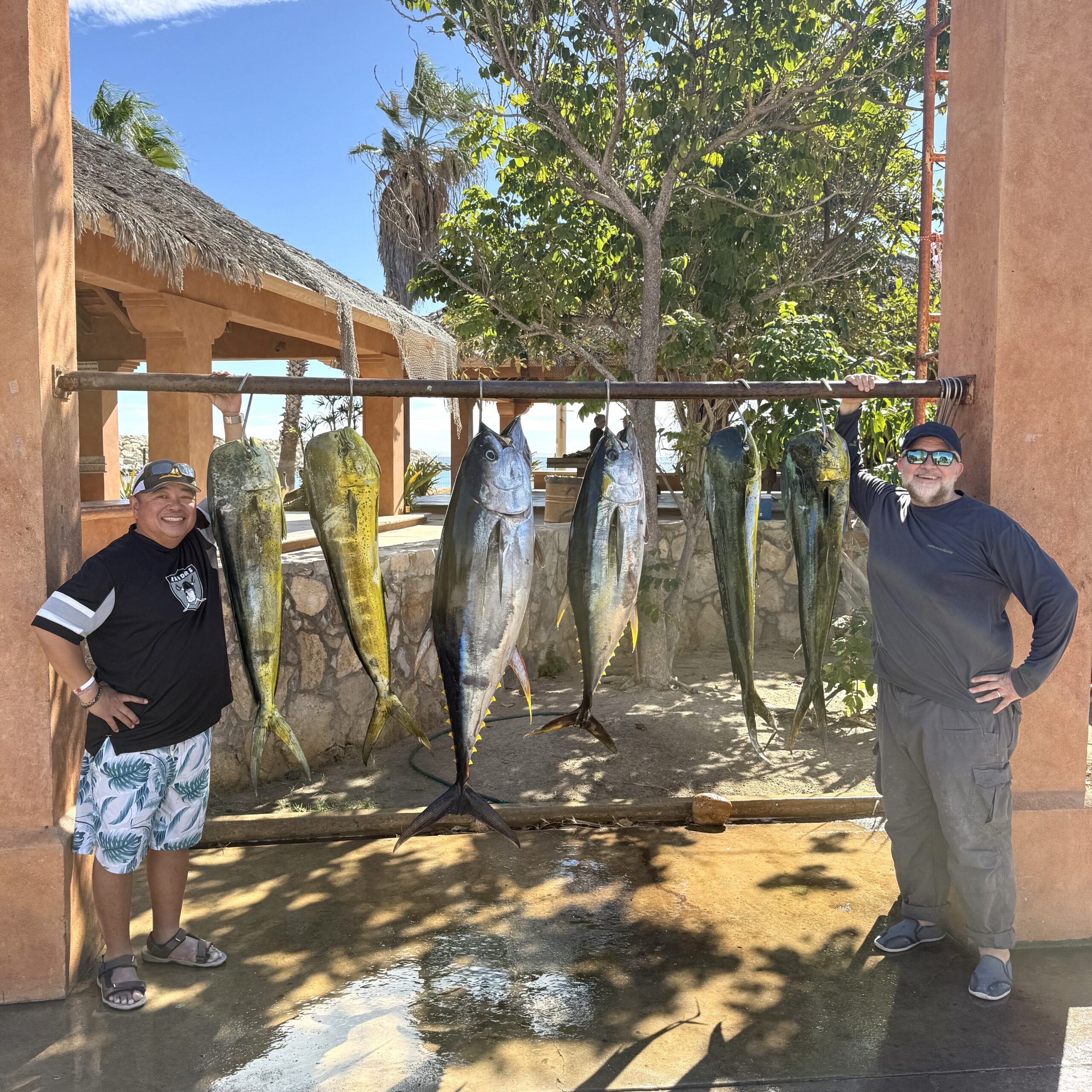The week started off good with decent action at the Inner and Outer Gordo. We saw more tuna action in the 40-to-70-pound range. These tuna were hooked on live bulito, small skipjack, chiwili, strips of squid, and some on live sardines. We also saw a handful of tuna in the 100-to-170-pound range within the same areas and bait. While slow trolling these baits, some nice 20-to-30-pound dorado were also caught. On Thursday, one of our pangas landed 5 yellowfin and 2 dorado. Two of these tuna were 165 and 155 pounds; the other 3 were 50 to 70 pounds, and the 2 dorado were averaging 25 pounds each. Some boats did not do so well as you really need to have patience if you are trolling baits at Gordo. After a few hours of trolling at the Gordo with no strikes, many boats decided to come in closer to shore to secure dinner with a dorado or two.