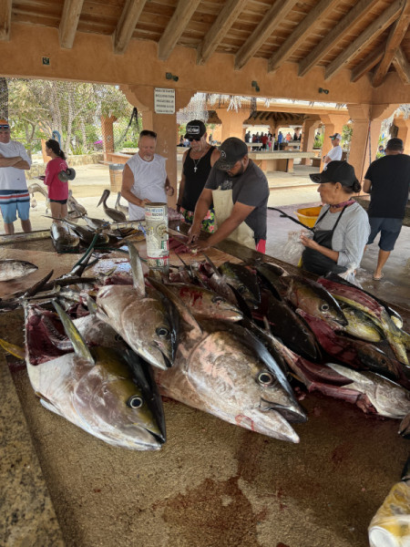 Water conditions have taken a turn after Saturday’s South wind. The port closed on Saturday due to 15-20 mph South winds and morning showers. This Sunday, as expected, fishing was much slower throughout all fishing grounds as water was colder and green. Many captains reported temperatures in the mid to high 60s and dirty water. This Sunday, only 3 medium size tuna and a couple of dorado were caught at the Gordo between 15 pangas or so. We had more action closer to shore, where boats found smaller tuna and dorado on live sardines and caballito.
